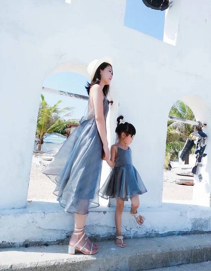 2018夏装新款亲子装母女装性感露背沙滩裙闪亮吊带连衣裙