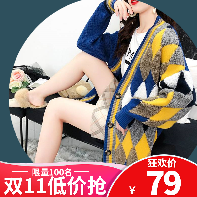 慵懒风针织开衫女2019秋冬新款女装中长款宽松洋气拼色毛衣外套厚