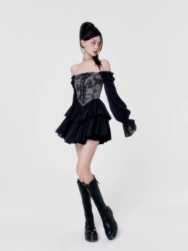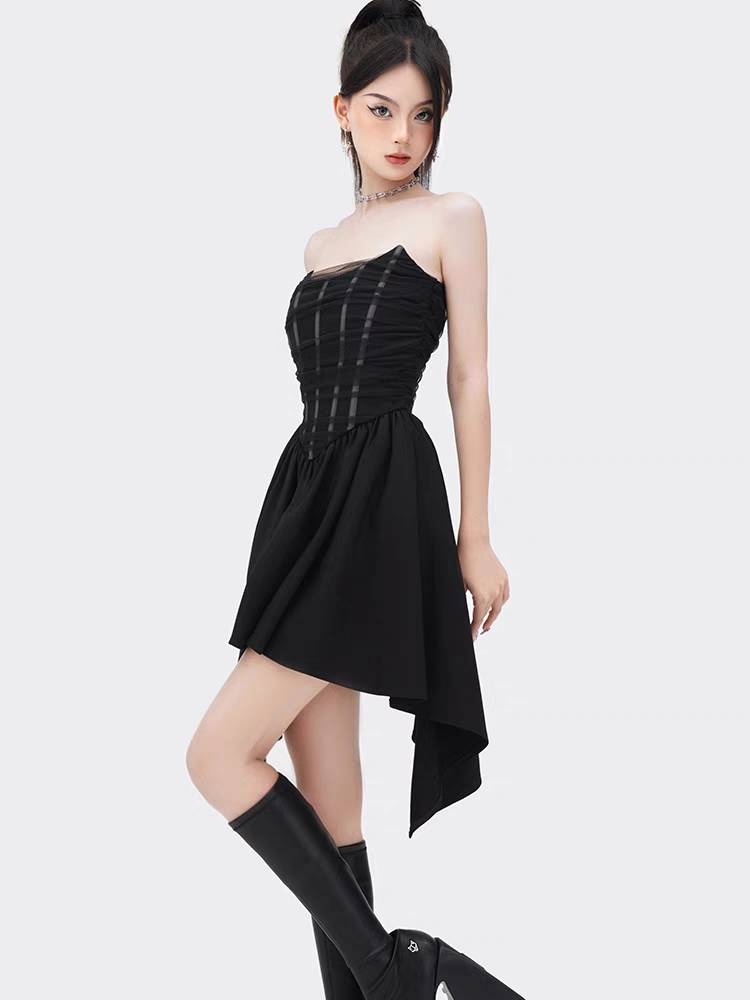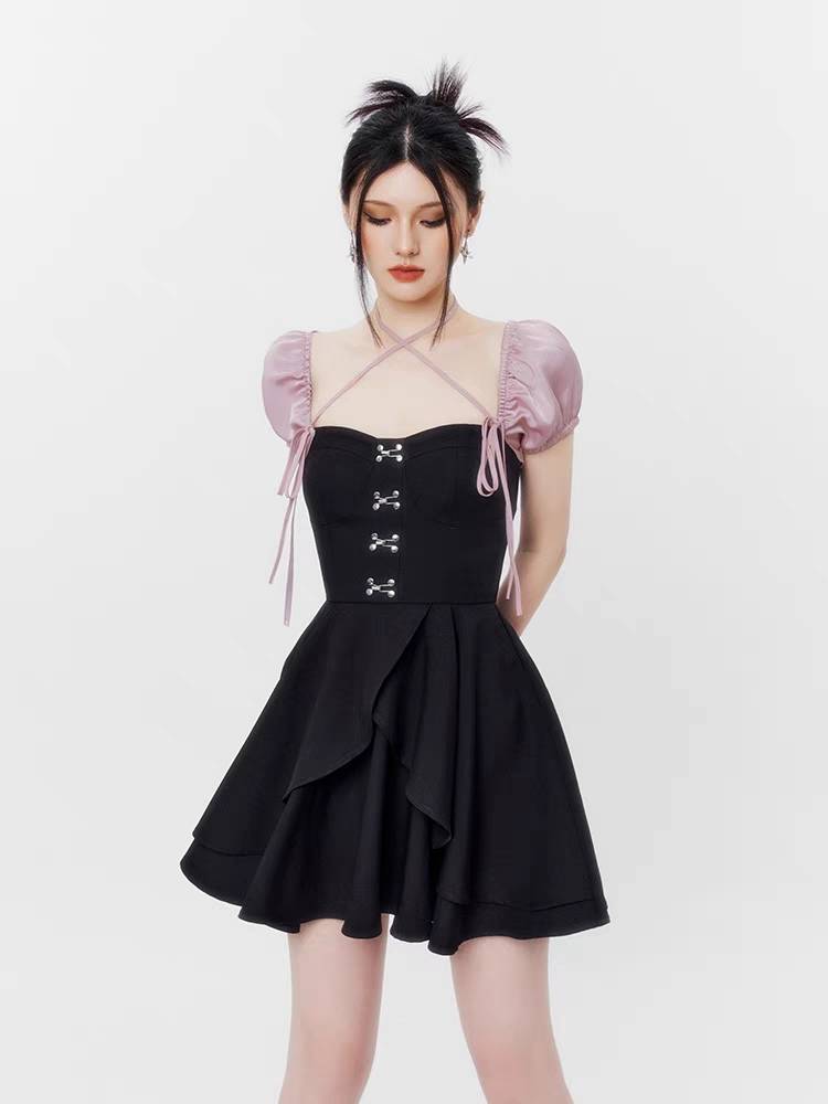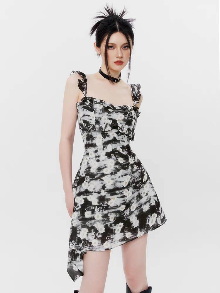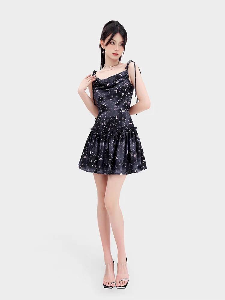 星空蝴蝶结肩带荷叶裙摆吊带连衣裙
