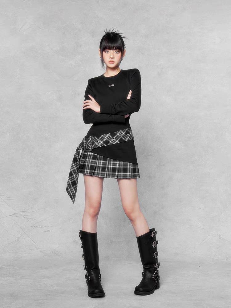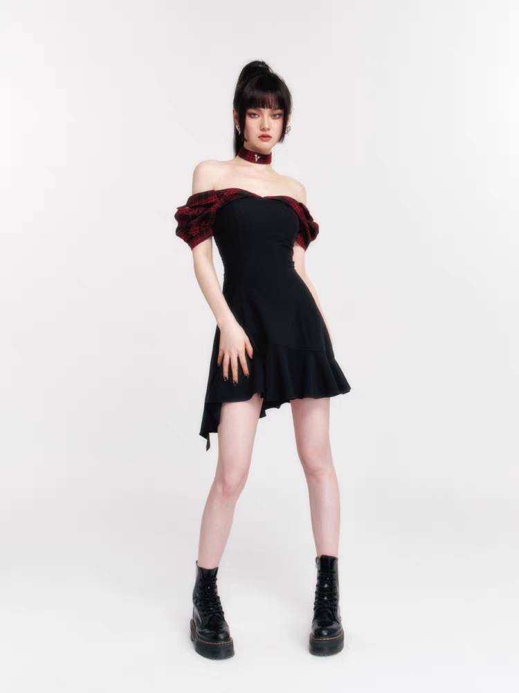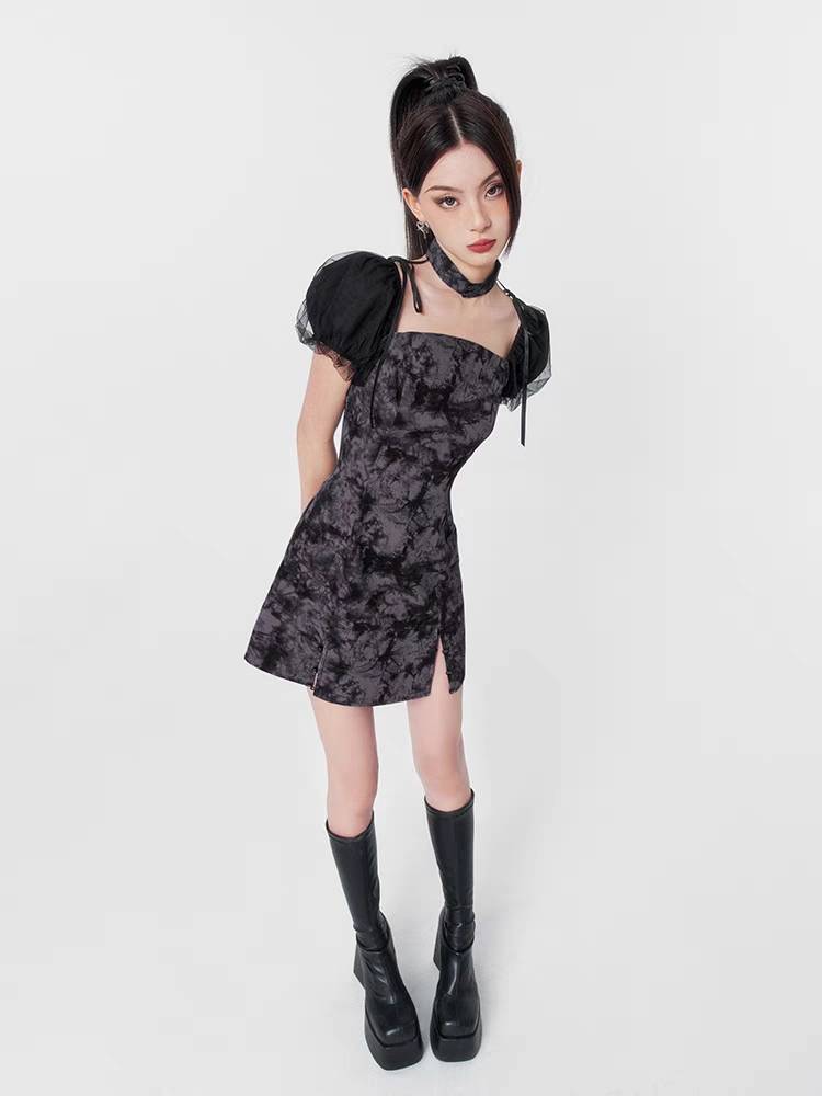 微弹花苞裙摆蝴蝶链条印花连衣裙
