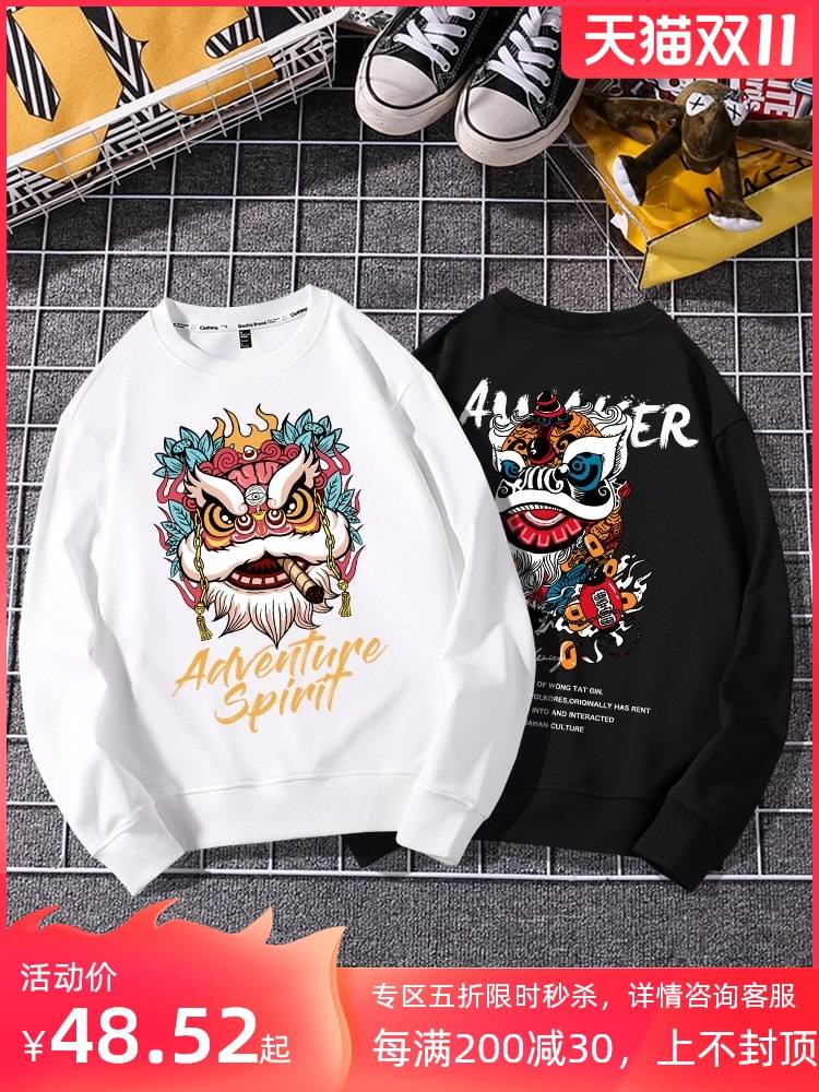 2021秋季港风潮牌简约薄款印花卫衣男青少年加绒圆领宽松休闲上衣