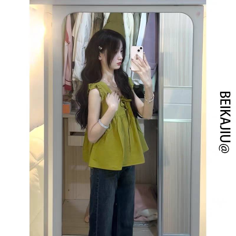 绿色法式蓬蓬木耳边小吊带背心女夏外穿宽松甜辣独特别致无袖上衣