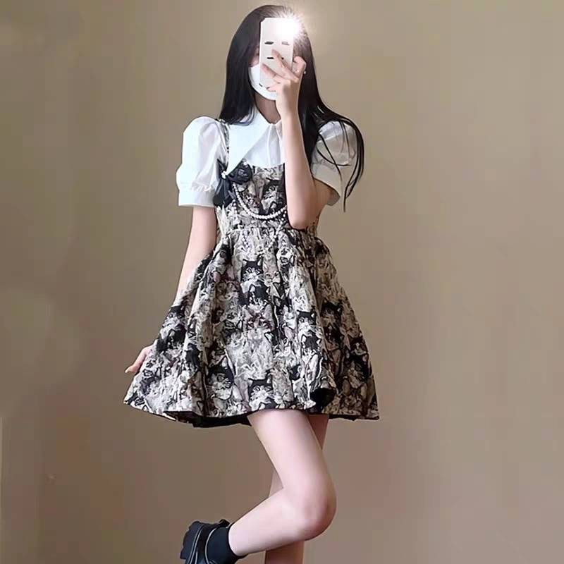 复古甜美蝴蝶结吊带连衣裙女夏季设计感小众显瘦气质泡泡袖小礼裙