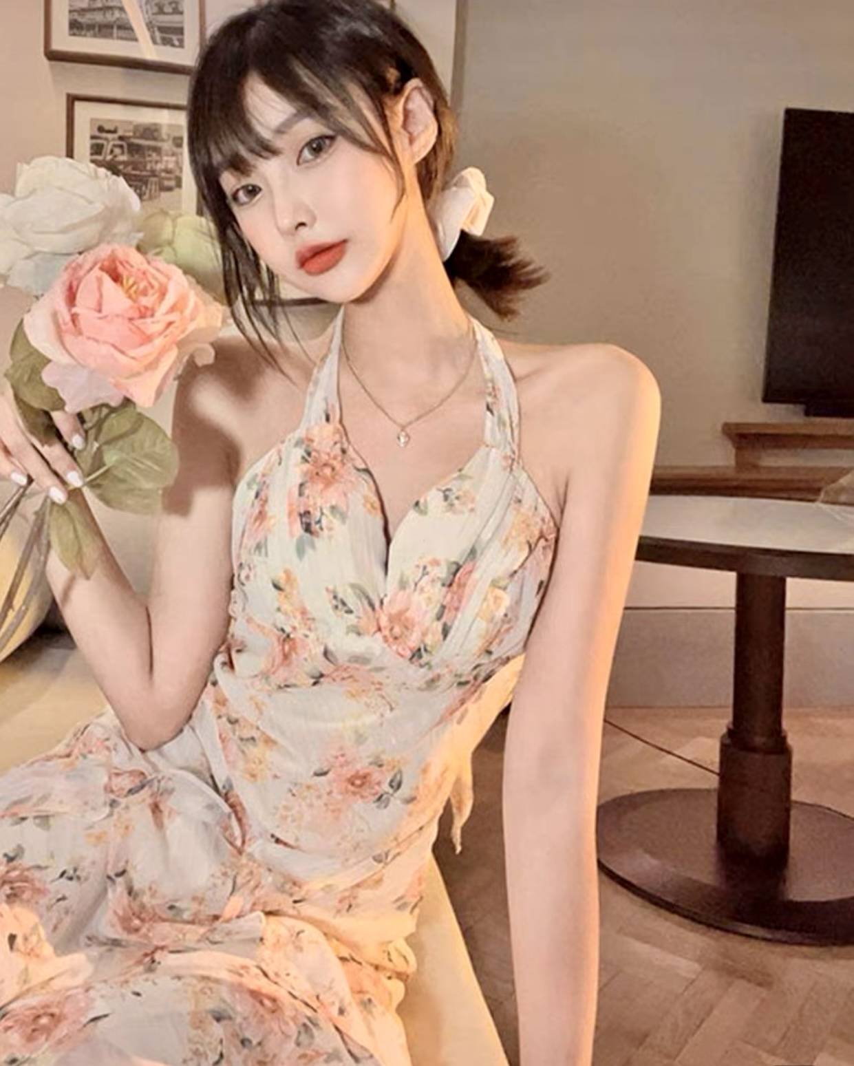 雪纺碎花吊带连衣裙v领收腰气质纯欲仙女裙
