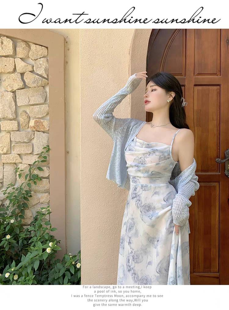 仙女超仙森系法式温柔风雪纺长裙水墨画吊带连衣裙开衫两件套装夏