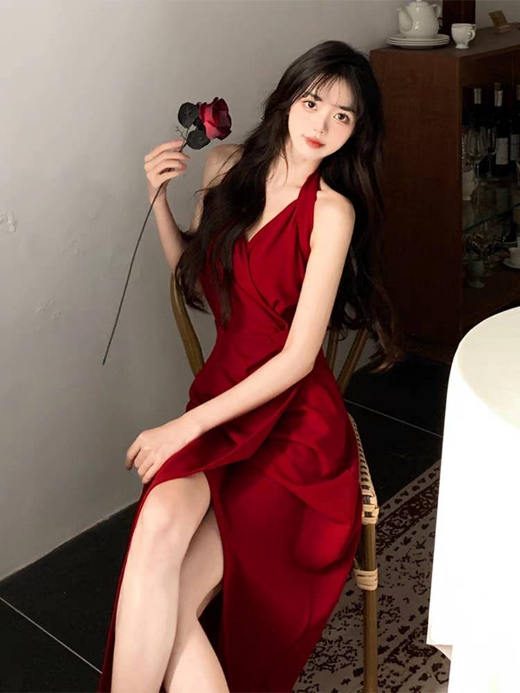 高级感红色挂脖吊带长裙大码2023夏季新款胖妹妹显瘦外搭连衣裙女