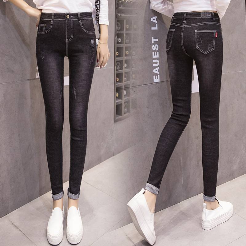 牛仔裤女秋款韩版女装2018新款弹力显瘦磨白字母小脚长裤牛仔裤女送红包