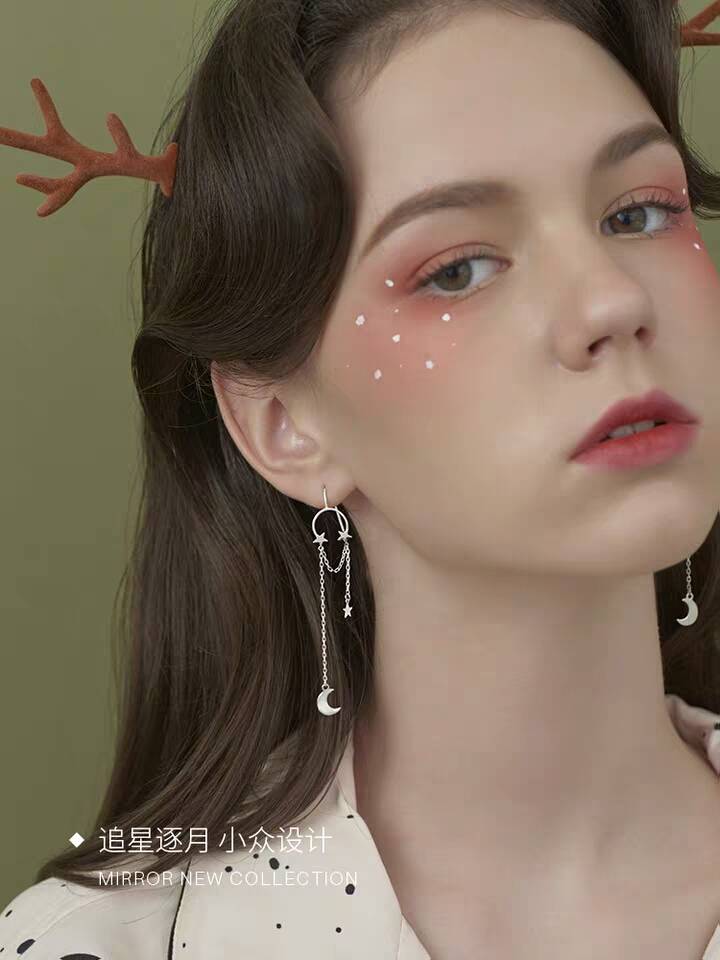 追星逐月流苏星星月亮可爱五角星S925纯银耳环耳坠耳钉女