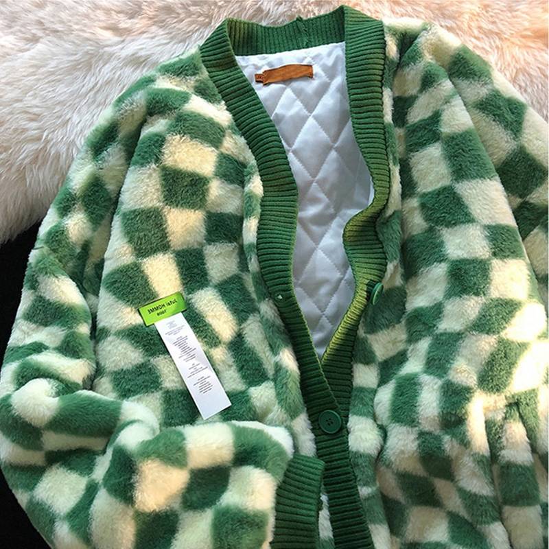 oversize棋盘格子羊羔毛外套女秋冬宽松ins慵懒风bf加厚棒球棉服