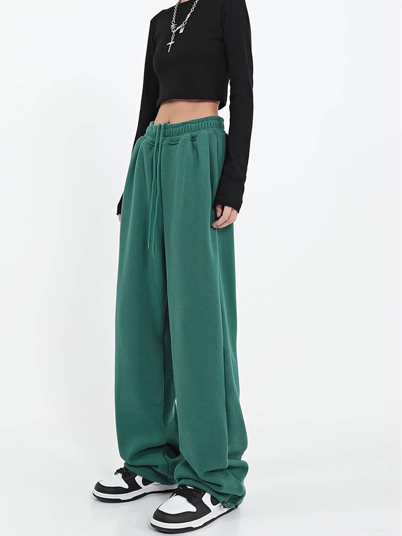 高街绿色运动休闲裤子女2021秋冬季加绒高腰直筒阔腿束脚抽绳卫裤