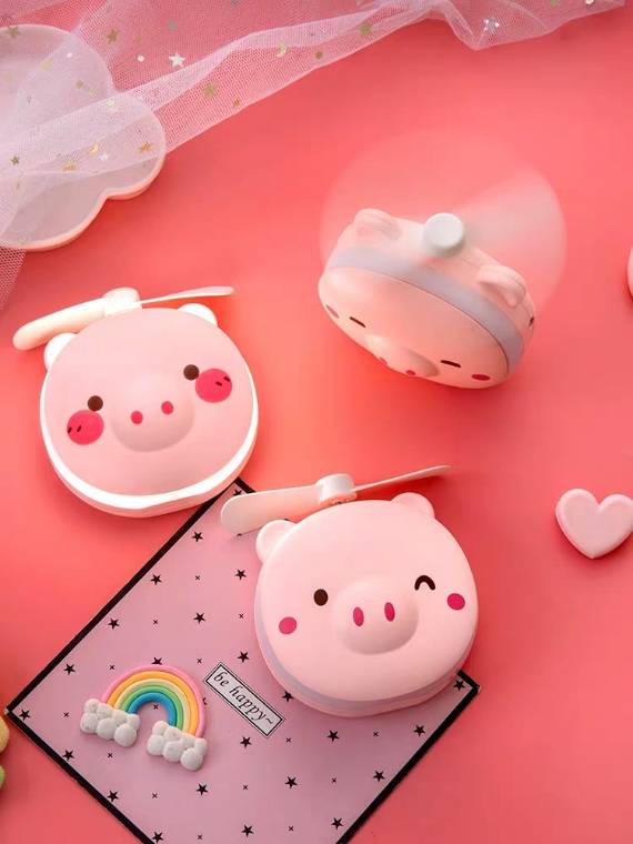 小猪抖音美妆镜小风扇带灯可爱卡通学生便携式电随身小型镜子同款