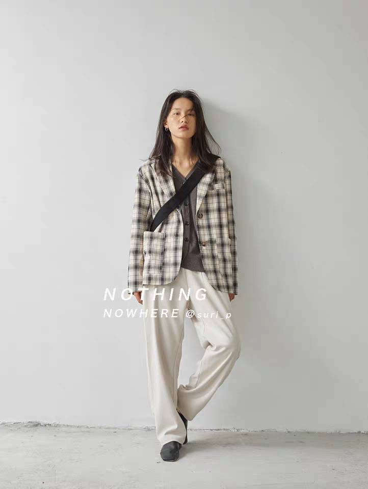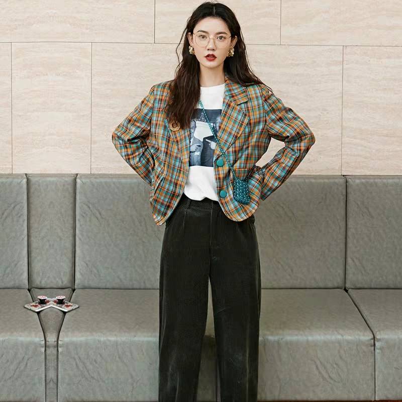 ANNZ原创 复古黄绿格子拼接撞色西装女宽松显瘦短款上衣外套春