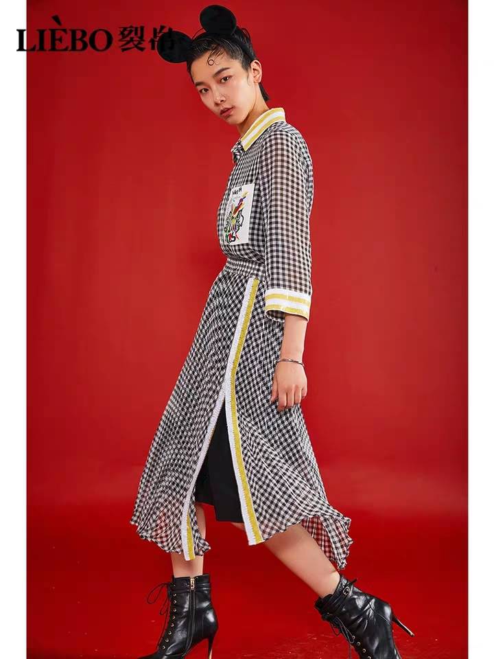 裂帛2020春季新款潮ins撞色拼接松紧腰雪纺百褶黑白格纹半身裙女
