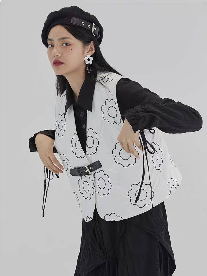 OceanMine原创设计 春季黑白双色撞色小花刺绣皮扣夹棉马甲