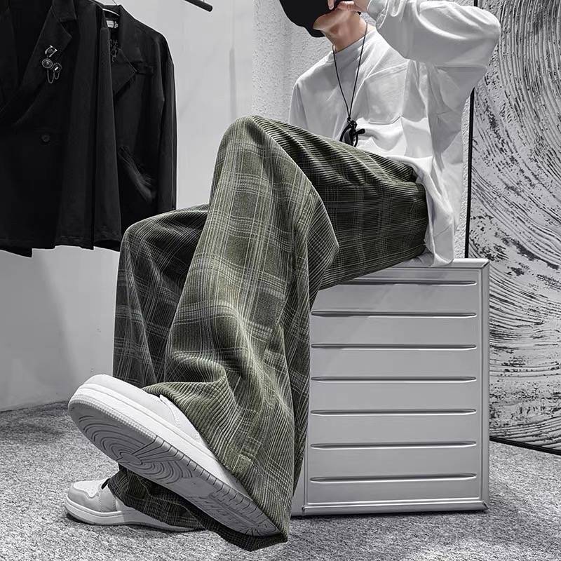 加绒高级感灯芯绒格纹直筒拖地裤欧美hiphop潮牌痞帅炸街阔腿裤男