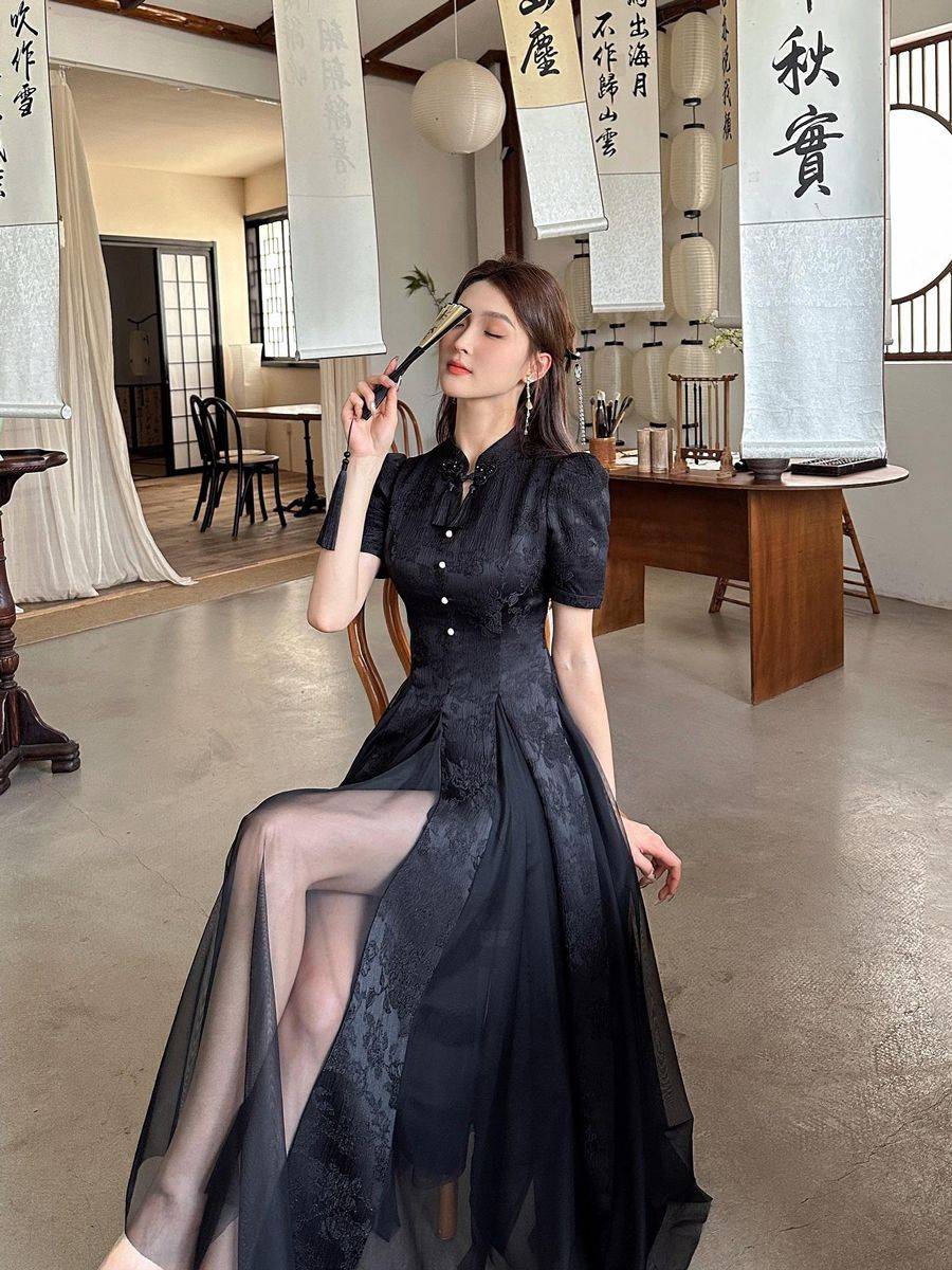 时尚黑色高级神秘感新中式连衣裙中国风旗袍改良气质优雅裙子夏季
