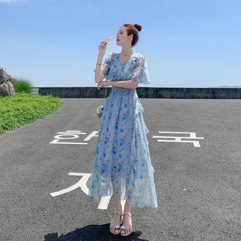 碎花洋气连衣裙女2023夏季新款中长款气质收腰显瘦法式高级裙子夏