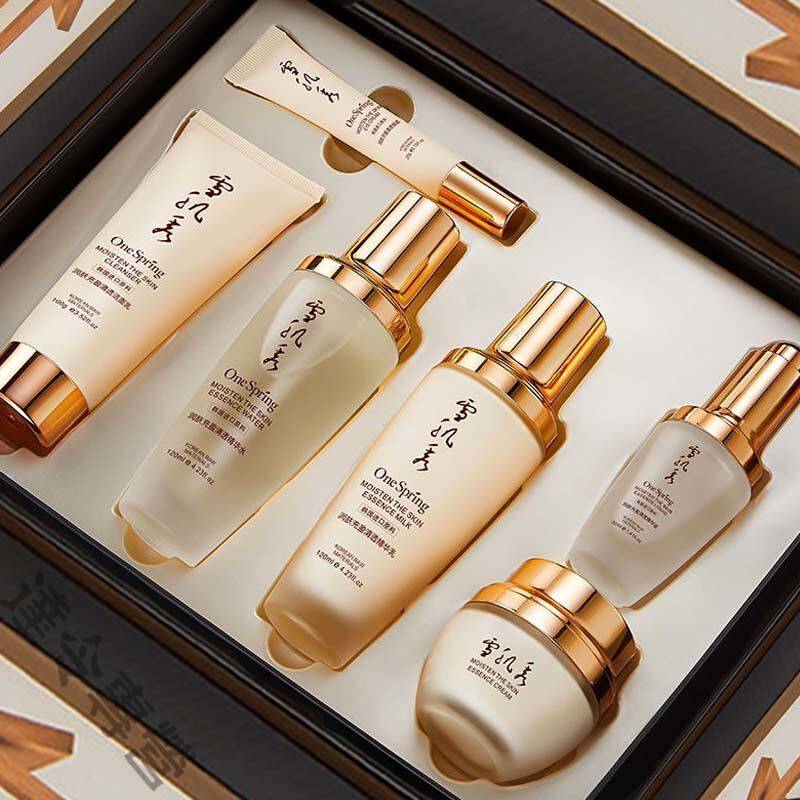 护肤品套装是由多种护肤品组合在一起的产品组合。通常包括洁面产品、爽肤水、乳液、面霜等。不同的护肤品套装可能针对不同的肤质