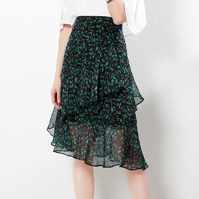 2019夏季新款名媛女装欧美荷叶边飘逸高腰包臀裙印花雪纺半身裙女