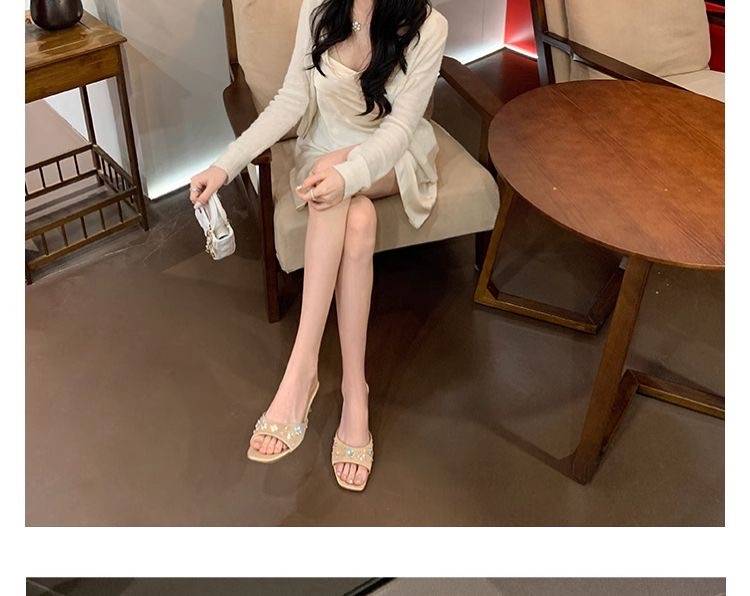 DRYWORLD花瓣绸缎水钻方头高跟拖鞋女夏外穿气质名媛猫跟细跟凉拖