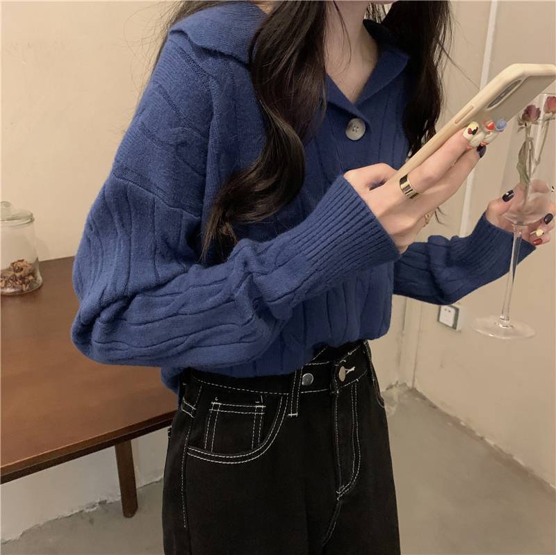 克莱因蓝色毛衣女秋冬季翻领polo慵懒风加厚2022年新款套头针织衫