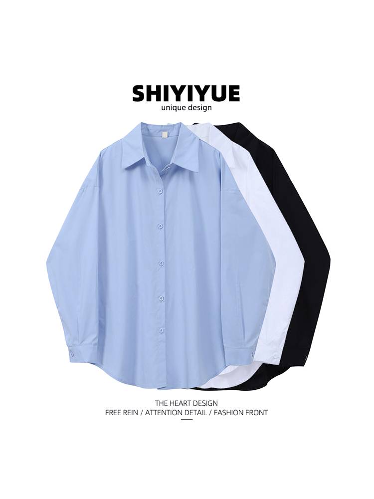 [现货]SHIYIYUE自制蓝色衬衫女秋设计感小众宽松小个子内搭白衬衣