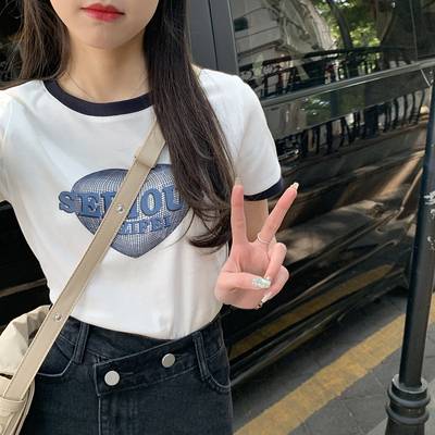 复古印花圆领短袖t恤2022夏季新款设计感小众辣妹正肩短款上衣女
