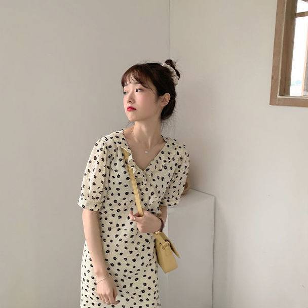 温柔甜美小清新V领显瘦花边领碎花雪纺2022夏季连衣裙女