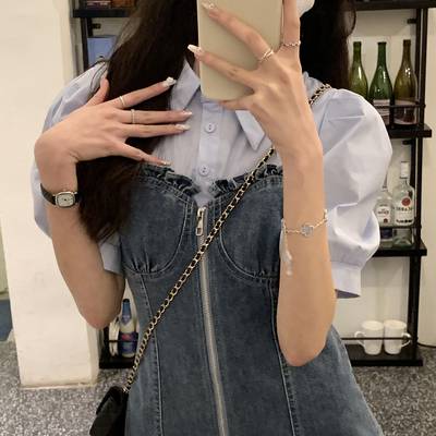 牛仔假两件连衣裙收腰复古港味气质2022夏新款设计感裙子