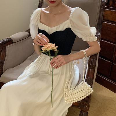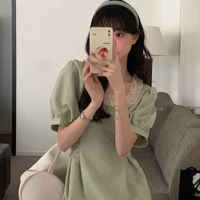 法式气质连衣裙女2022夏季甜美温柔泡泡袖方领收腰中长裙