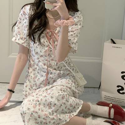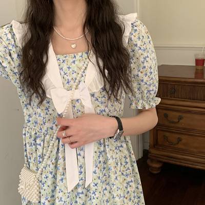 夏季连衣裙女2022新款气质泡泡袖甜美蛋糕裙收腰仙女裙子