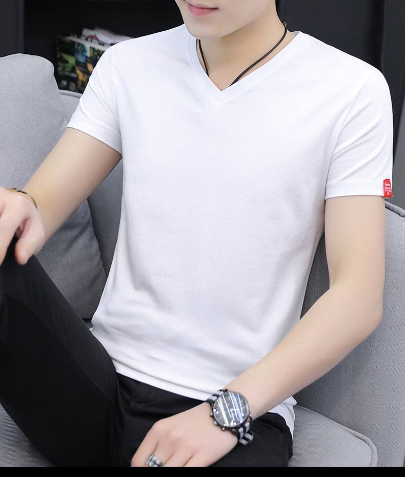 高端夏季男士短袖T恤纯棉修身潮流V领白色半袖上衣纯色百搭体恤T