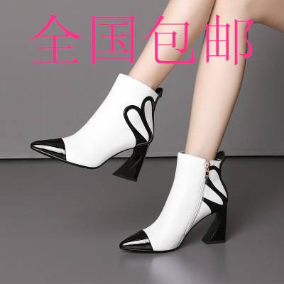 2018秋冬季新款里外真皮女鞋尖头细跟高跟鞋靴女金属电镀跟短靴女