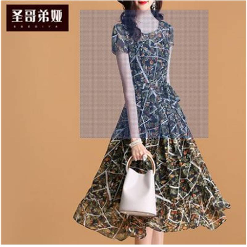 圣哥弟娅35岁到45的连衣裙女夏2018新款短袖气质雪纺碎花裙中长款