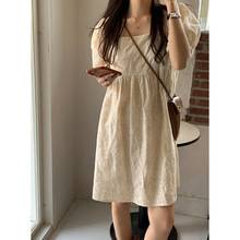 2021夏季新款法式复古方领提花泡泡袖连衣裙女
