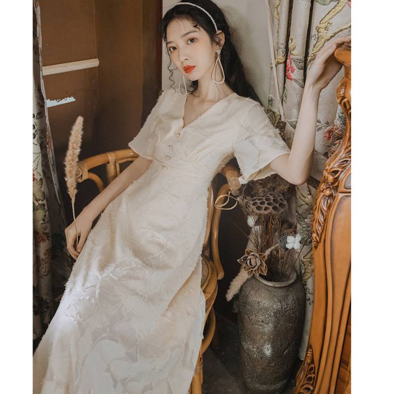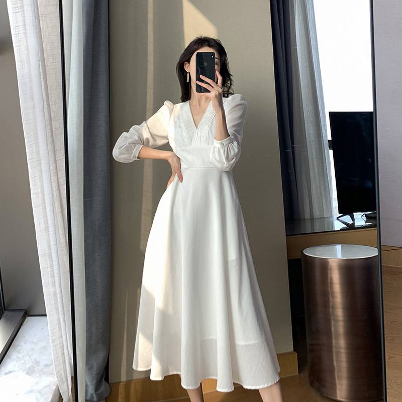 白色连衣裙2021早春新款女装V领法式气质修身女神范长裙