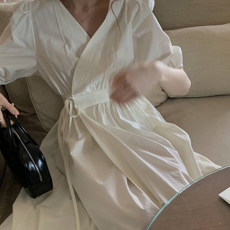 2021年夏新款韩国东大门V领长款收腰系带连衣裙法式优雅