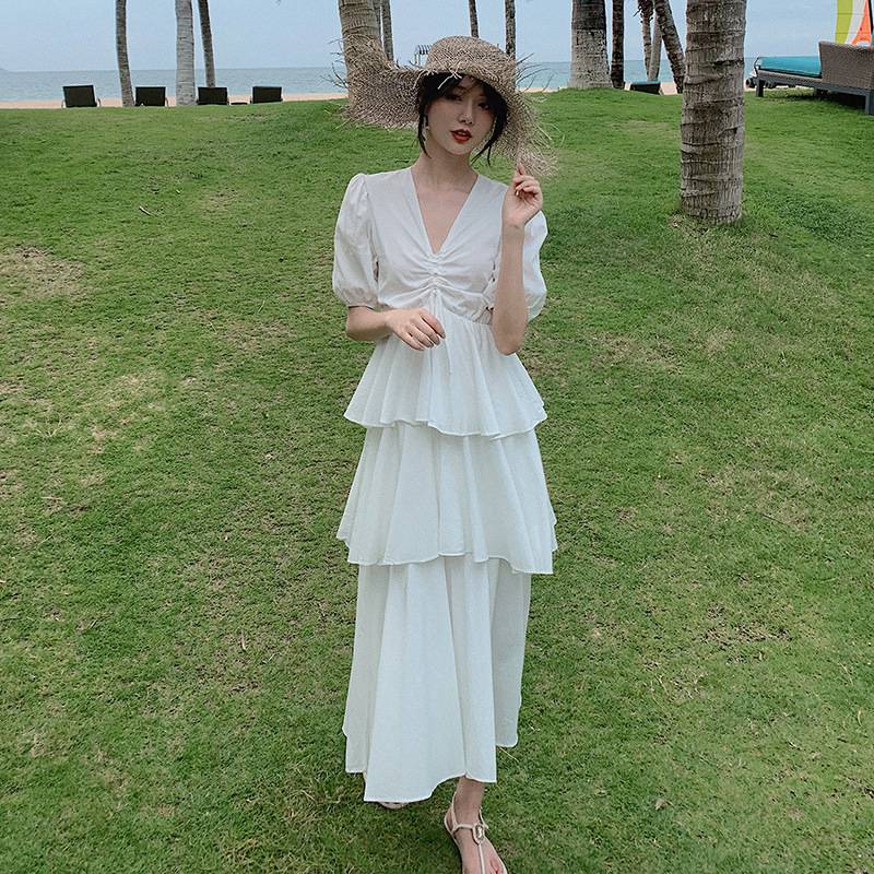 法式V领泡泡袖连衣裙女2021夏季新款收腰显瘦雪纺蛋糕裙长裙