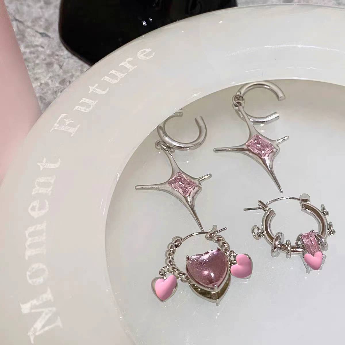 【瓜瓜饰品】小众女设计感机能风镀银粉钻水晶爱心耳圈不对称宝石