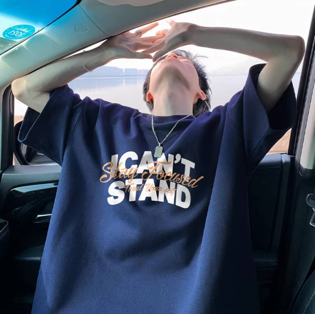 藏青色纯棉短袖男夏季重磅百搭t恤美式字母半袖宽松潮牌潮流体恤