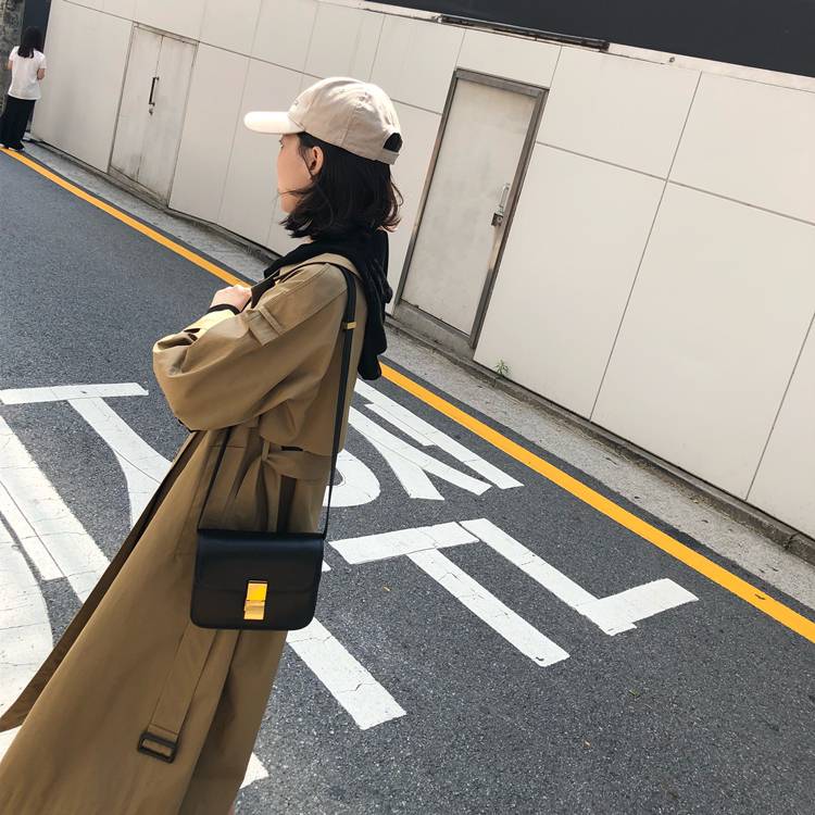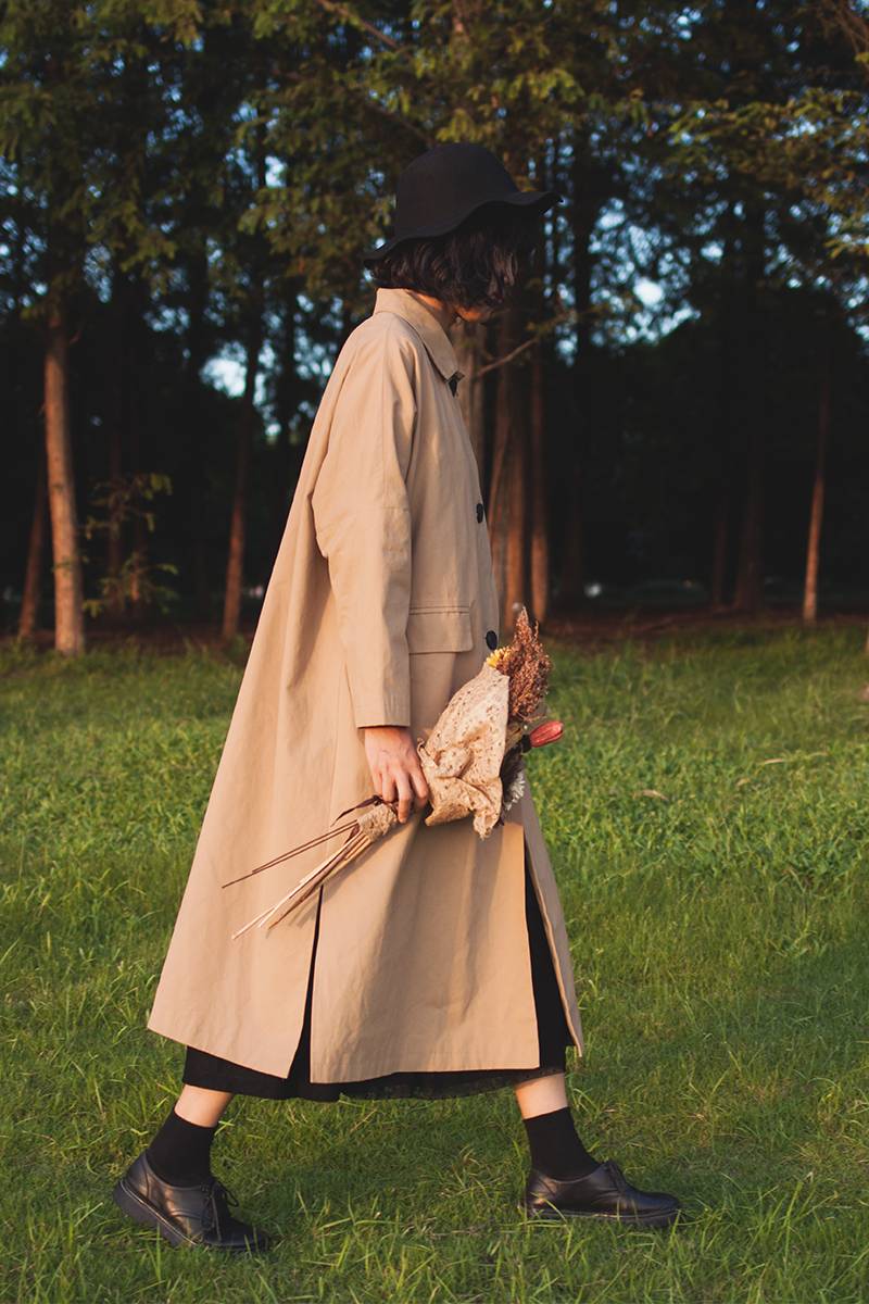 三巷自制 方领宽松纯色女外套 卡其复古设计中长款风衣 秋上新