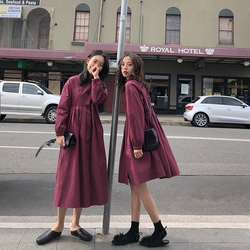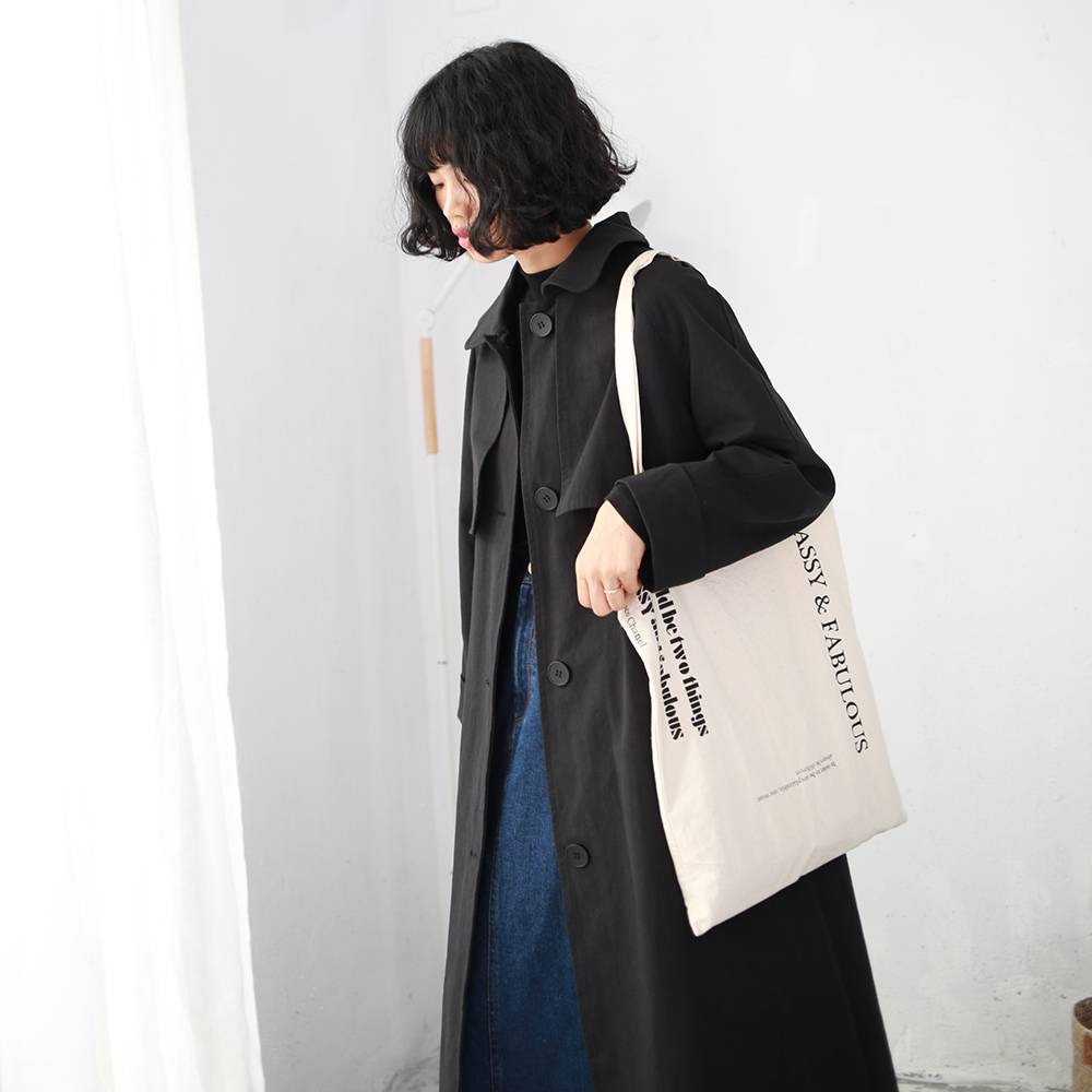 三巷自制 方领斜纹棉A型中长款 宽松女风衣长袖纯色 2018秋新外套