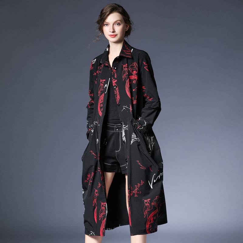 咫尺2018秋装新款宽松中长款印花薄风衣女装大码休闲显瘦百搭外套