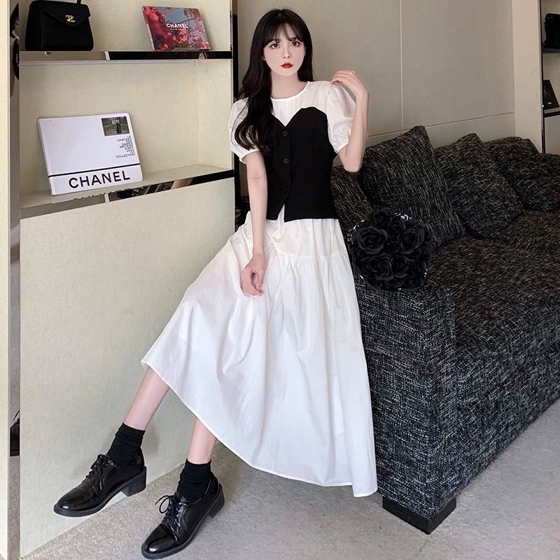 #315实拍实价 法式连衣裙女设计感撞色假两件收腰显瘦泡泡袖裙子