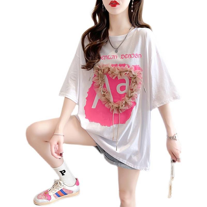 抖音质量纯棉短袖t恤女夏2022潮网纱刺绣花圆领新款上衣大码女装