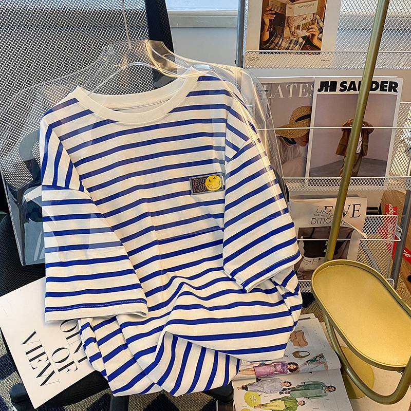 抖音质量短袖t恤女夏2022韩版潮条纹刺绣花圆领新款上衣大码女装
