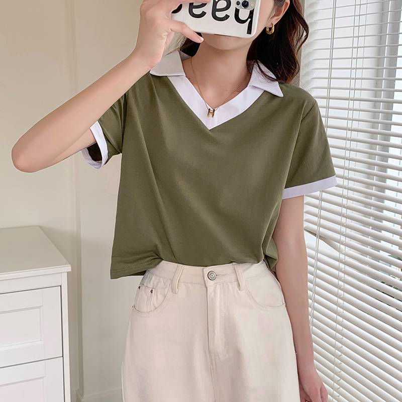 3627#实拍纯棉t恤女短袖2022年新款夏正肩短款polo衫v领上衣ins潮