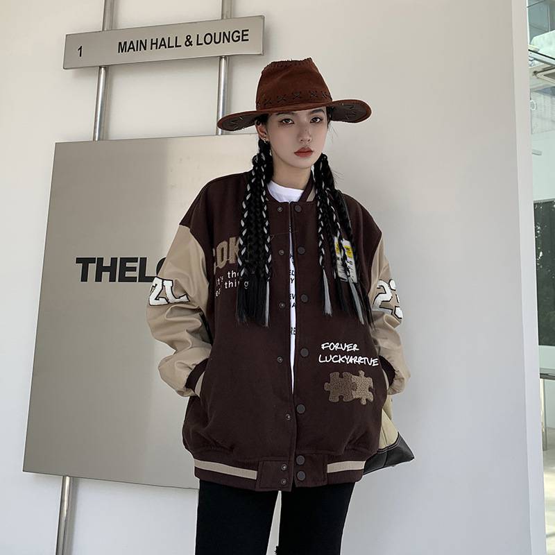 美式复古棒球服中性风女春秋呢料拼皮袖子外套嘻哈高品质夹克ins