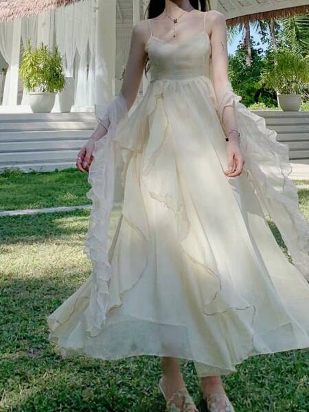 俏皮两件套法国小众雪纺蝴蝶袖防晒开衫+重工大摆裙吊带连衣裙女