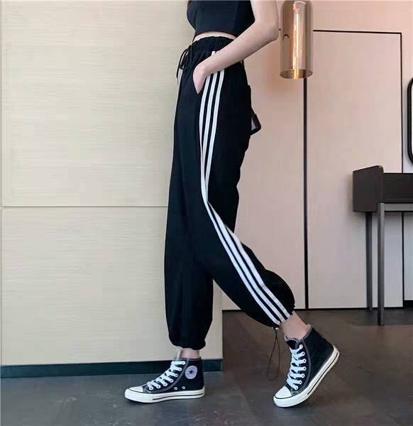港风复古竖条纹运动裤女学生三杠宽松休闲女裤春秋2019新款阔腿裤